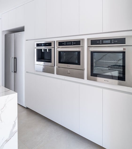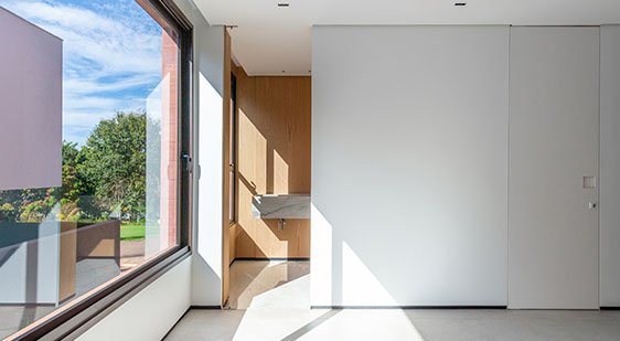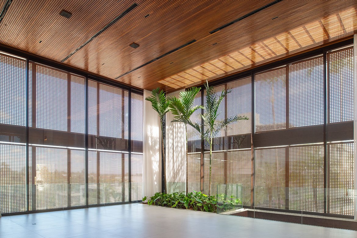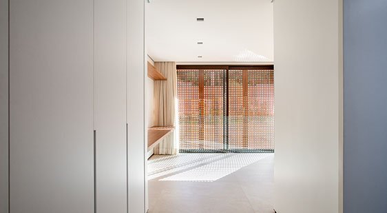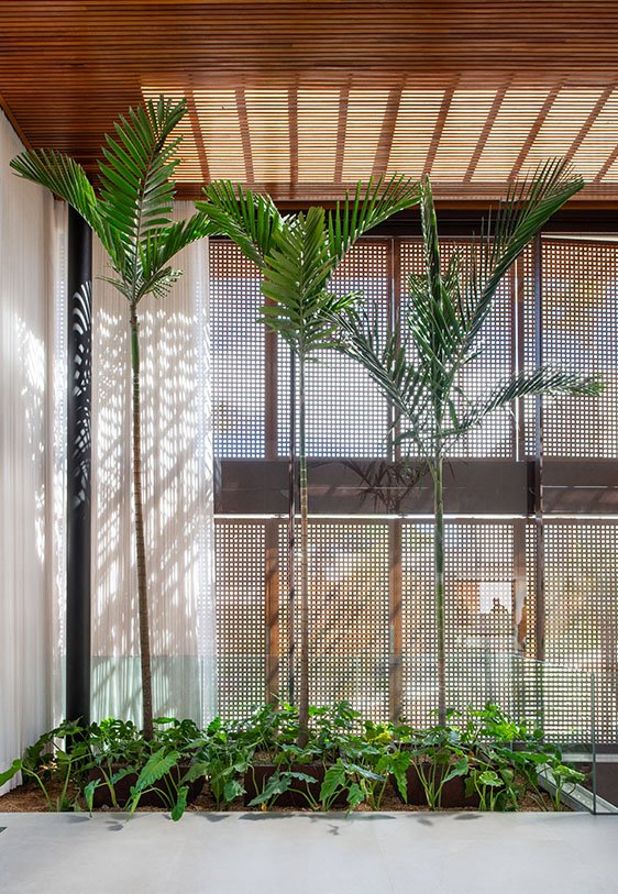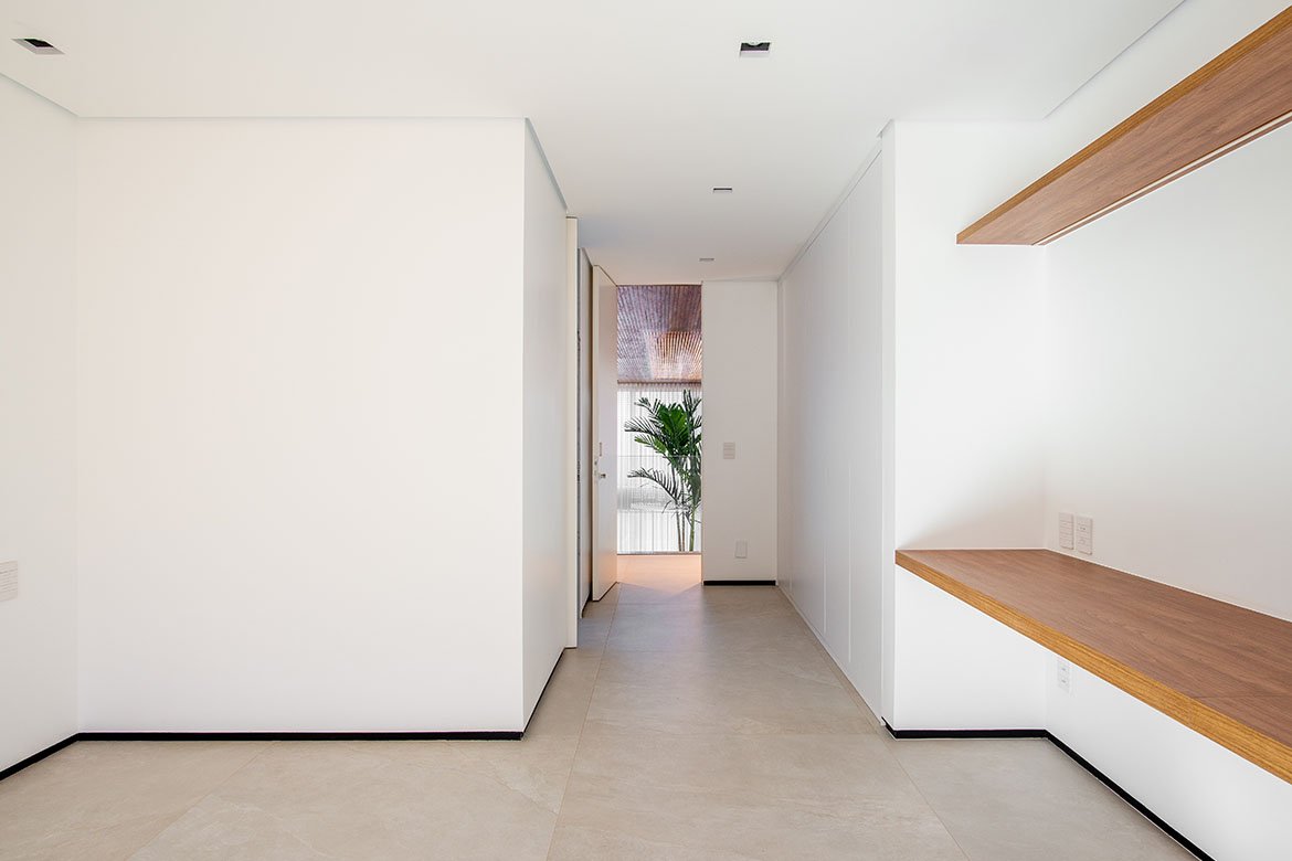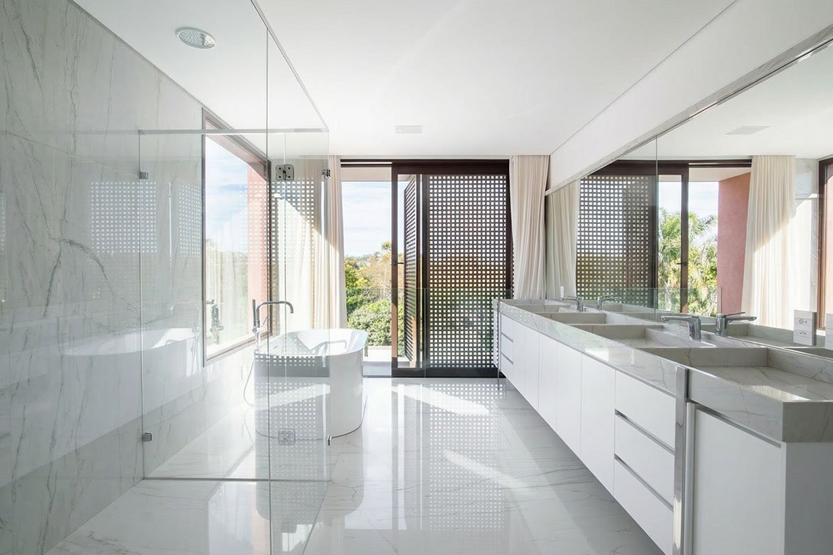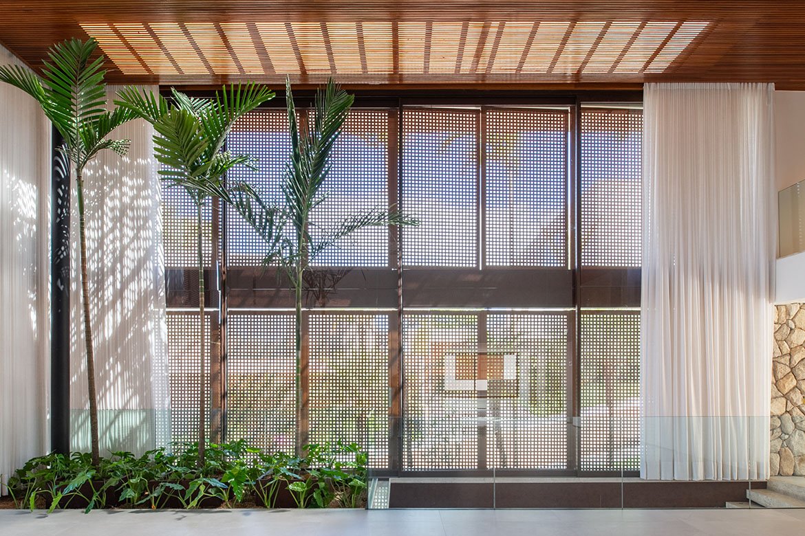Os ambientes íntimos incluem quatro suítes, com destaque para a suíte master, estrategicamente posicionada para apreciar o poente. A escolha por superfícies claras amplia a sensação espacial e intensifica a luminosidade natural, que atravessa os painéis vazados e revela um jogo elegante de luz e sombra. Esse recurso arquitetônico não apenas filtra o sol, mas também imprime dinamismo e poesia visual ao ambiente, transformando cada instante do dia em uma experiência sensorial.