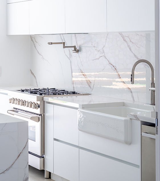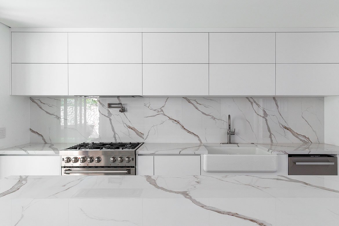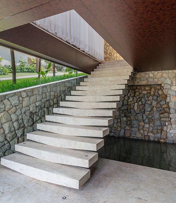 A escada transcende o convencional. Desenvolvida em concreto maciço e revestida em mármore nobre, ela foi concebida sob medida para ser uma peça única, exclusiva para esta residência. Uma imponente claraboia mimetiza sua projeção, juntamente com o jardim interno, criando uma sinergia visual que confere uma notável sensação de ascensão e luminosidade no acesso ao living room.