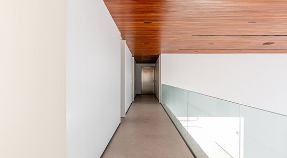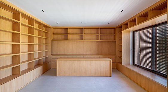 Com pé-direito duplo, o ambiente se revela com uma surpresa marcante ao subir a escada principal de acesso à residência. Integrado a esse espaço, o escritório se destaca pelo uso de prateleiras em madeira, pensadas para acomodar desde coleção de livros a materiais de estudo, unindo funcionalidade e elegância com o restante da casa.