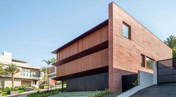 O uso de materiais naturais como madeira e pedra, assim como cores escuras, trazem aconchego e sofisticação para a fachada. Brises em madeira completam esta composição e servem para amenizar a incidência do sol da tarde e permitir a apreciação da vista mesmo com esta voltada para o poente.